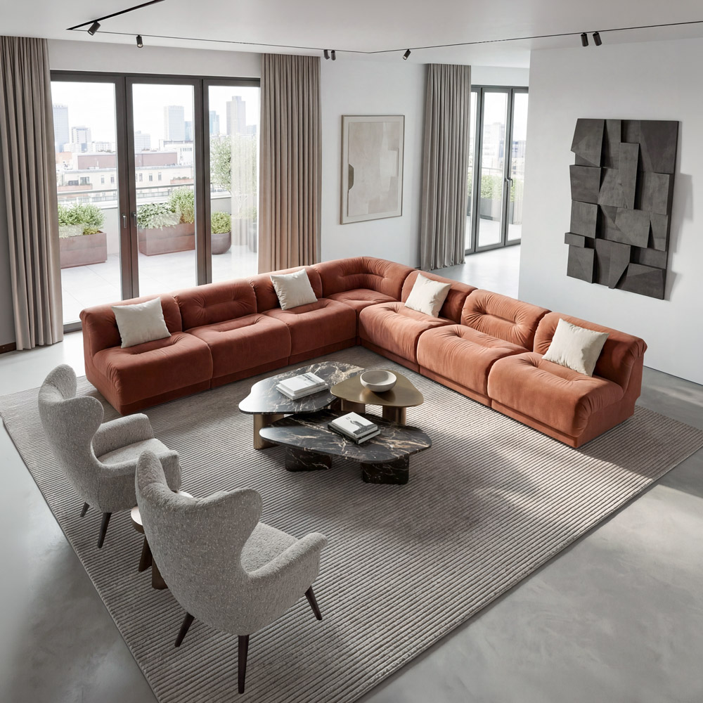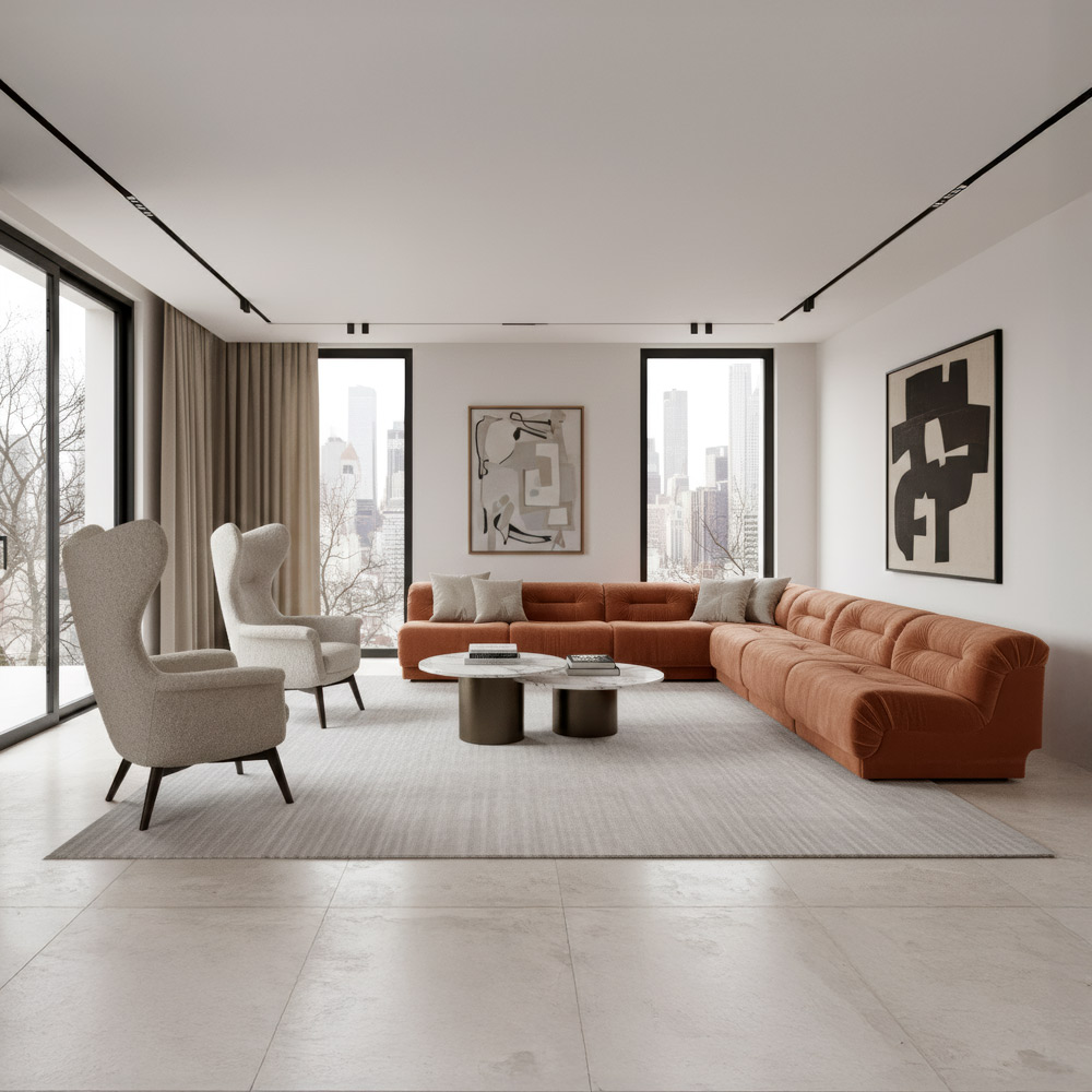 Un canapé au design contemporain, défini par des formes douces et des proportions équilibrées. Parfait pour créer une atmosphère accueillante et raffinée dans tout espace de vie.